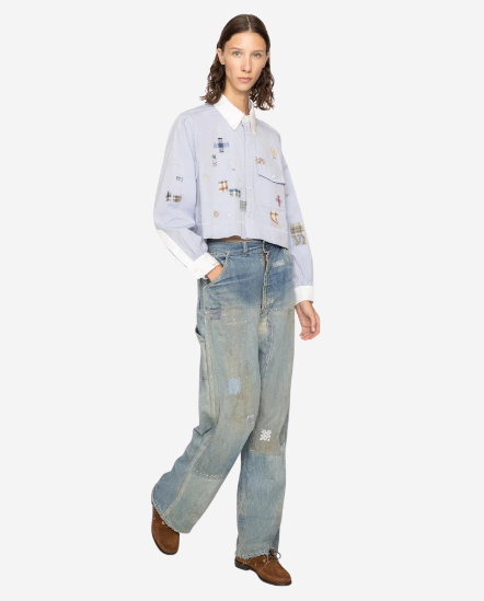 Claira撞色領袖口刺繡長袖襯衫