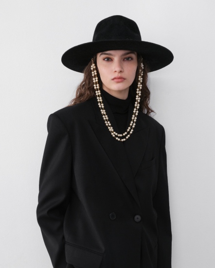 RB字珍珠串鍊毛氈凹頂紳士帽/黑色