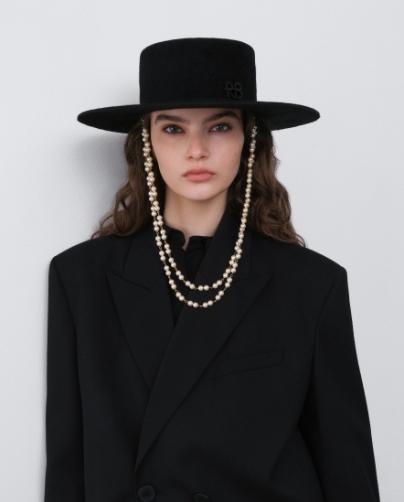 RB字珍珠串鍊毛氈平頂紳士帽/黑色
