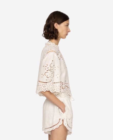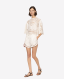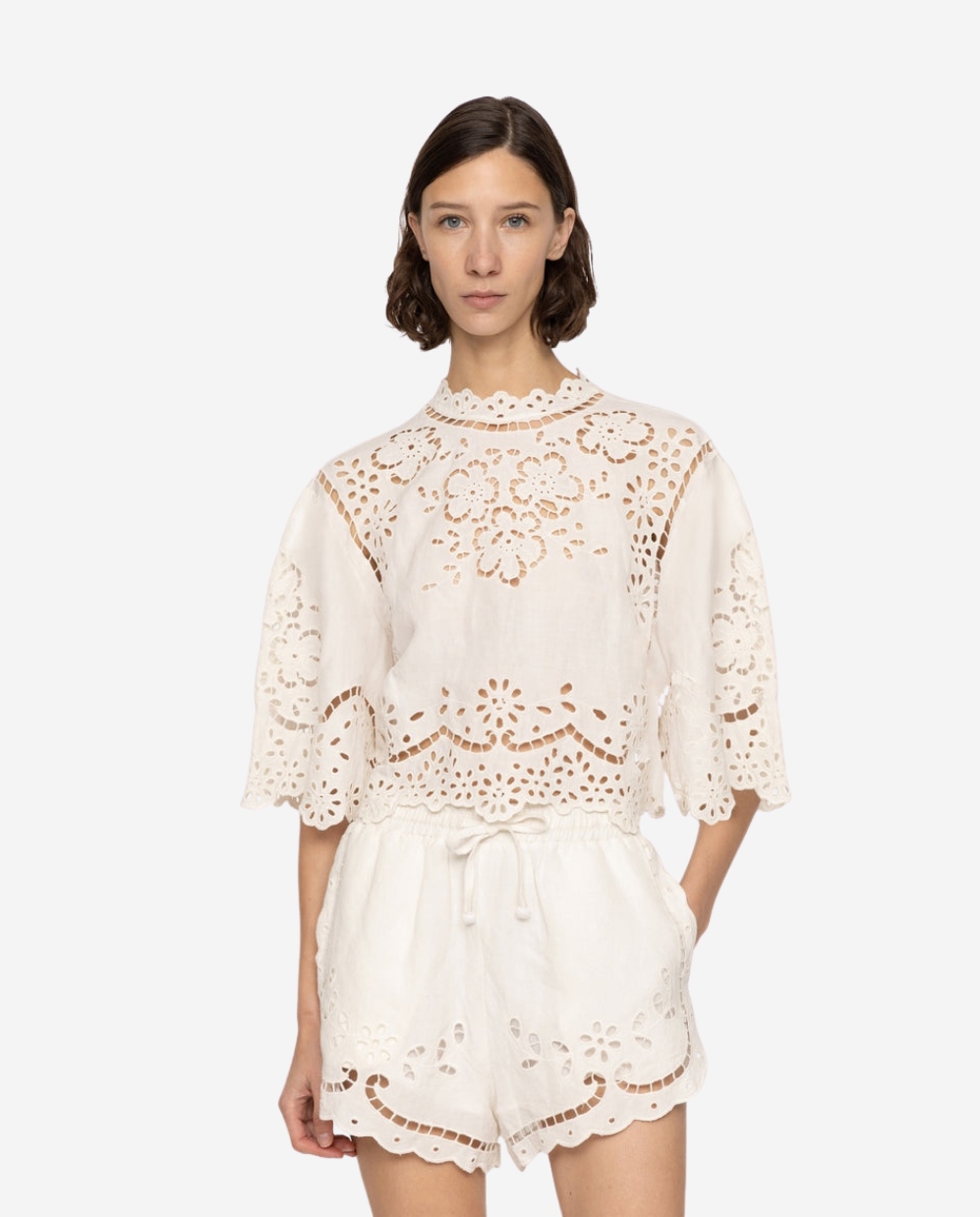 採用刺繡孔眼細節設計,短袖飄逸,高領,短版輪廓