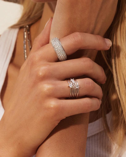 Triple Stone菱形圓方鑽多圈雕空戒指/銀色